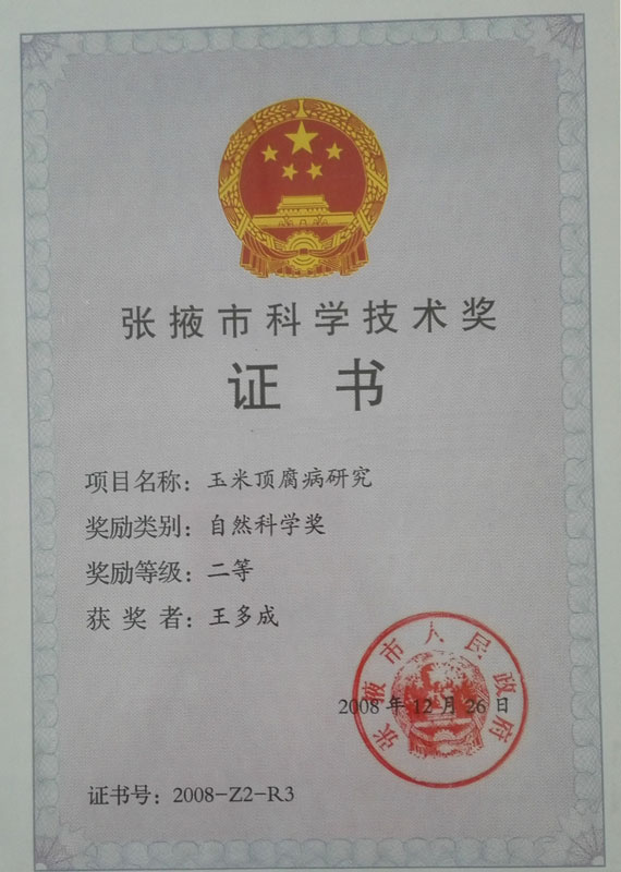 2008年榮獲張掖市科學(xué)技術(shù)二等獎證書