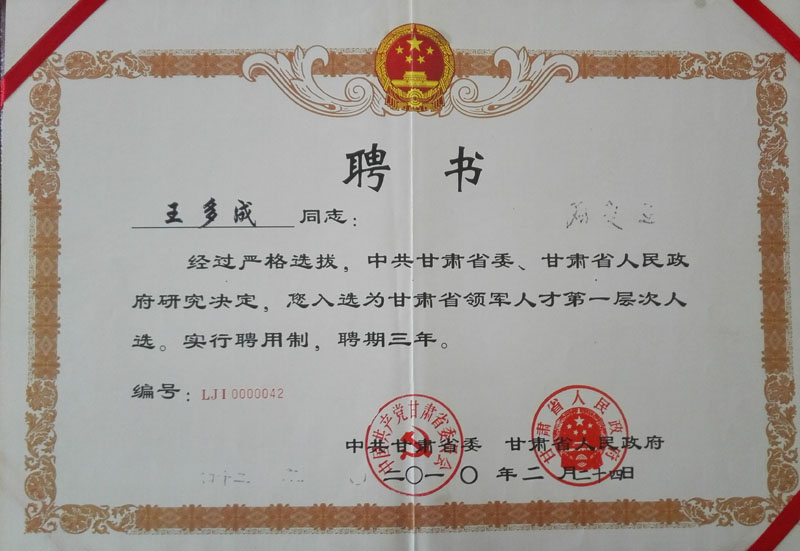 2010年榮獲入選為甘肅省領軍人才第一層次人員證書